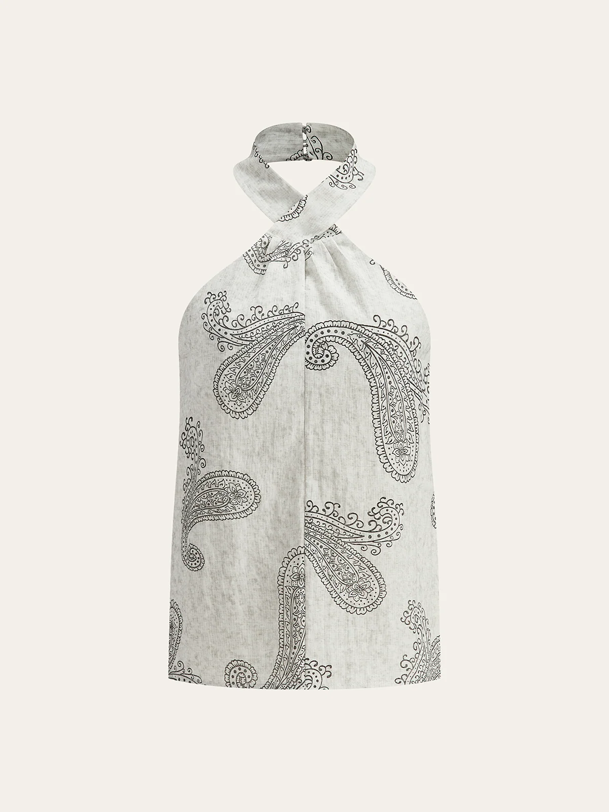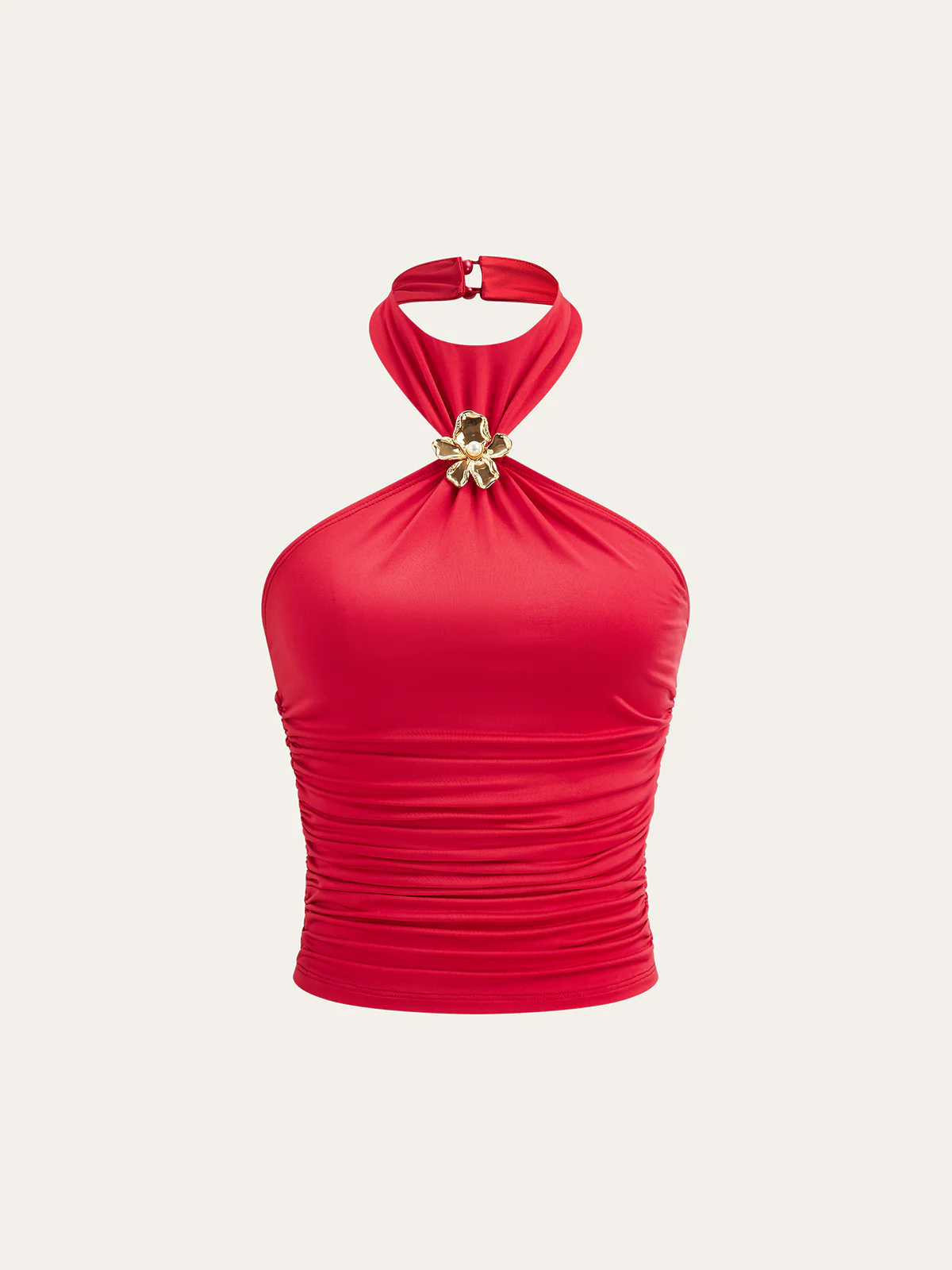 Semi-Sheer Halter Neck Ruched Top with Metal Floral Decor