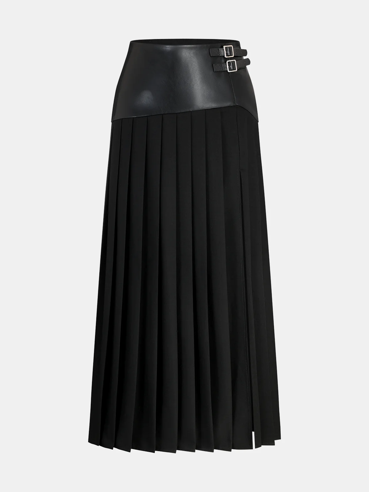 Buckle Detail Faux Leather Panel Pleated Midi Skirt