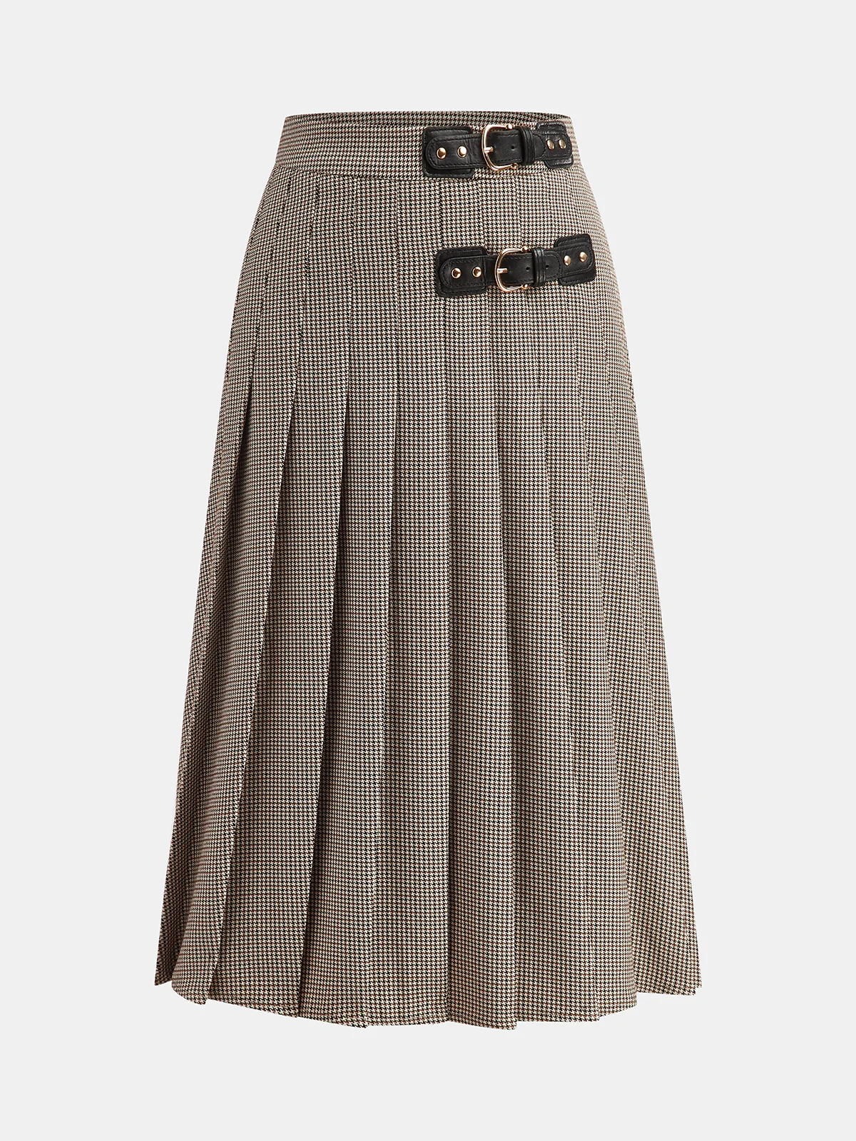 Buckle Detail Houndstooth Pleated Midi Skirt