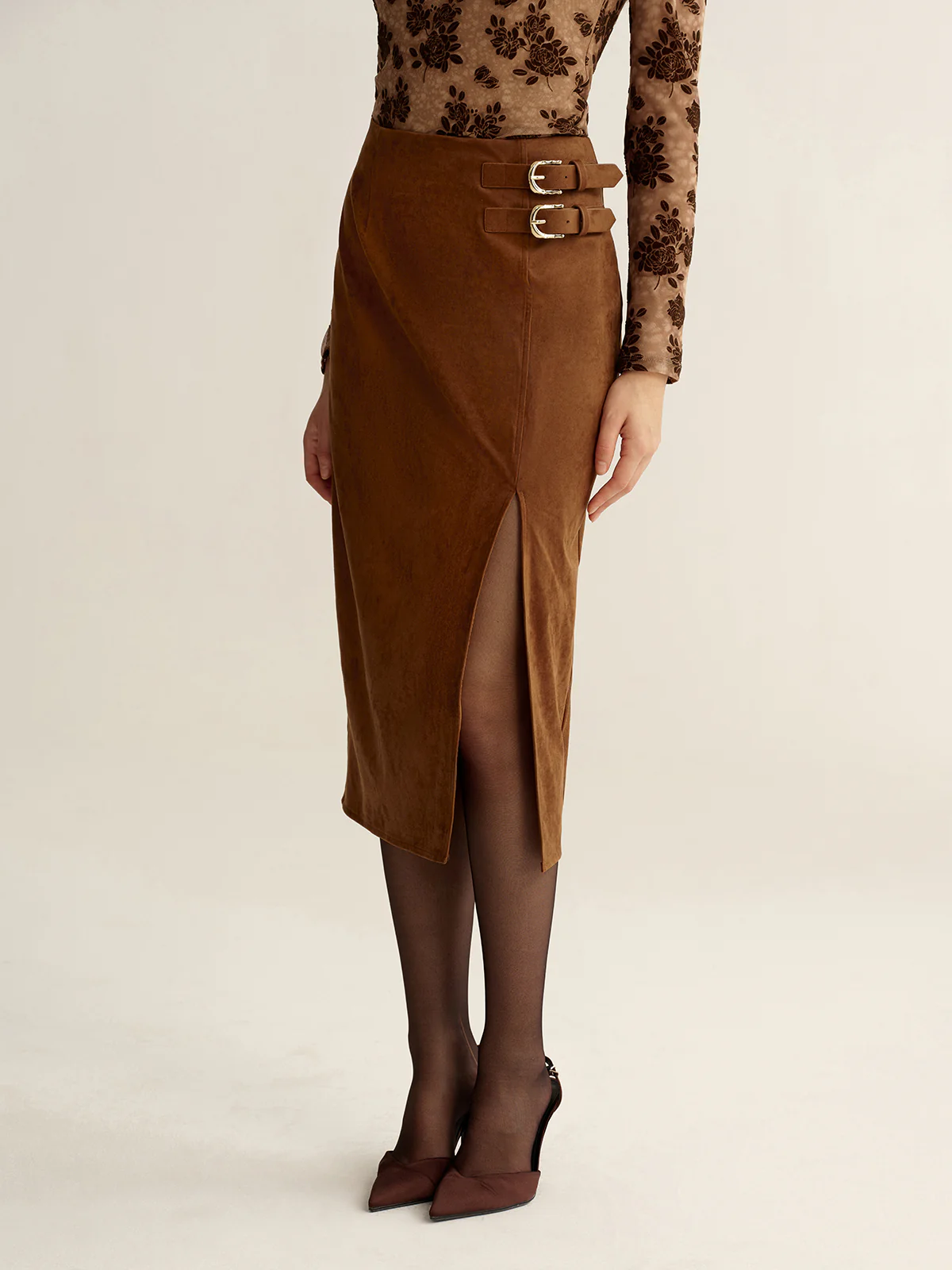 Buckle Detail Suede Effect Midi Skirt