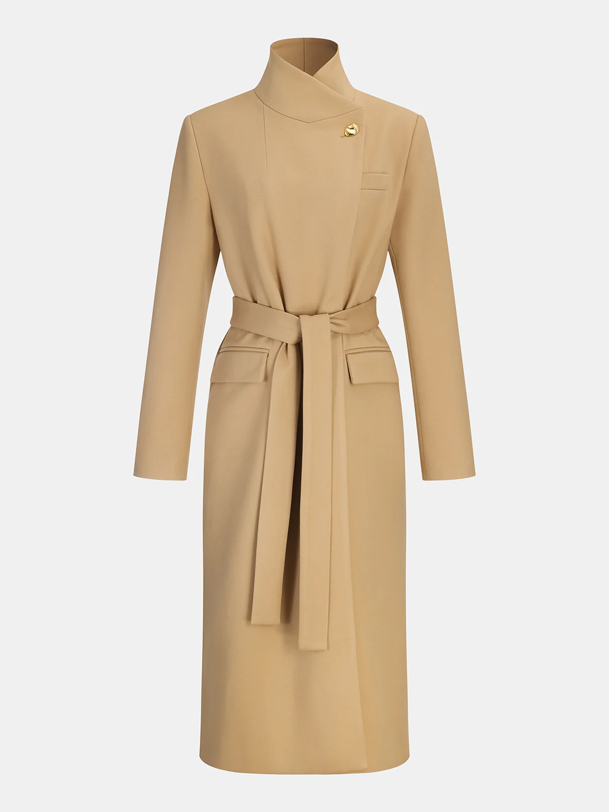 Belted Metal Button Stand Collar Longline Coat