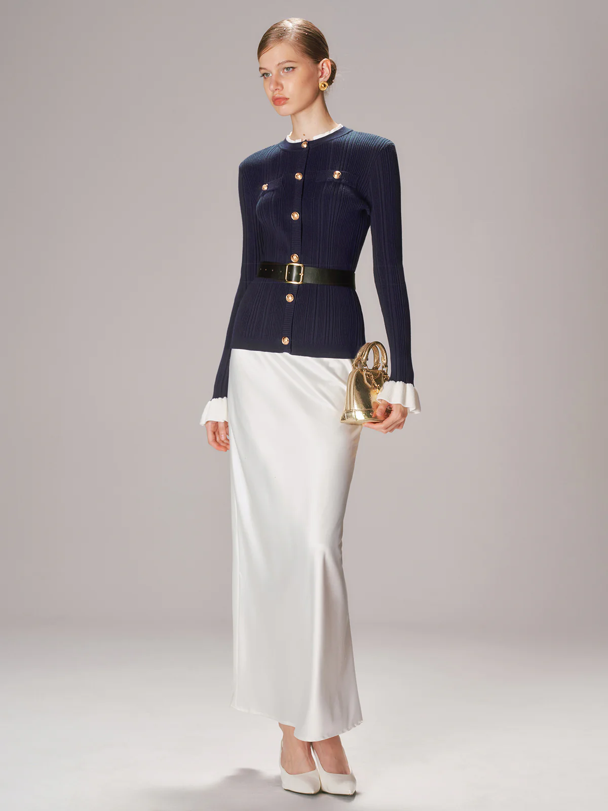 Belted Metal Button Ribbed Knit Top