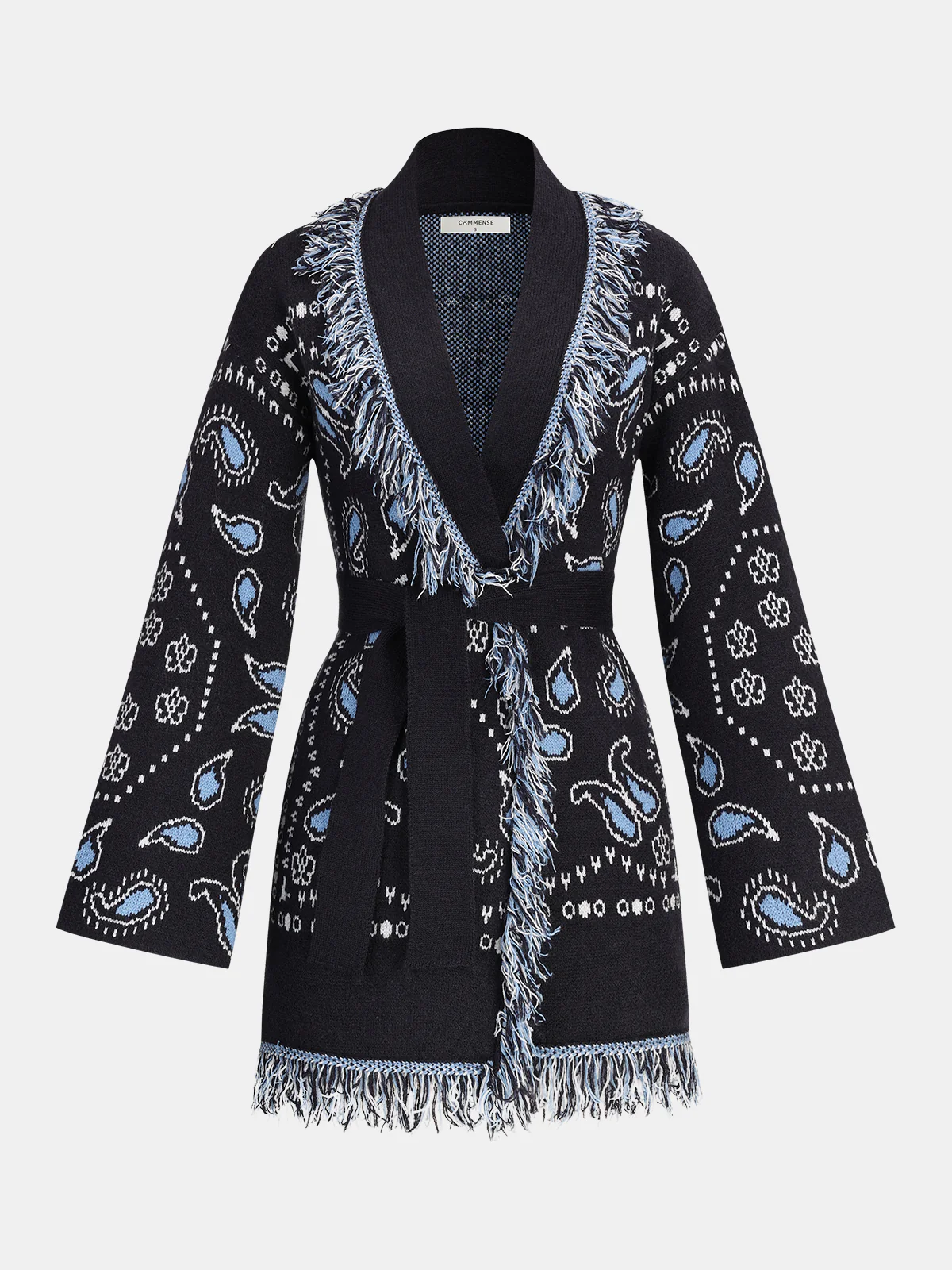 Belted Paisley Fringe Knit Cardigan