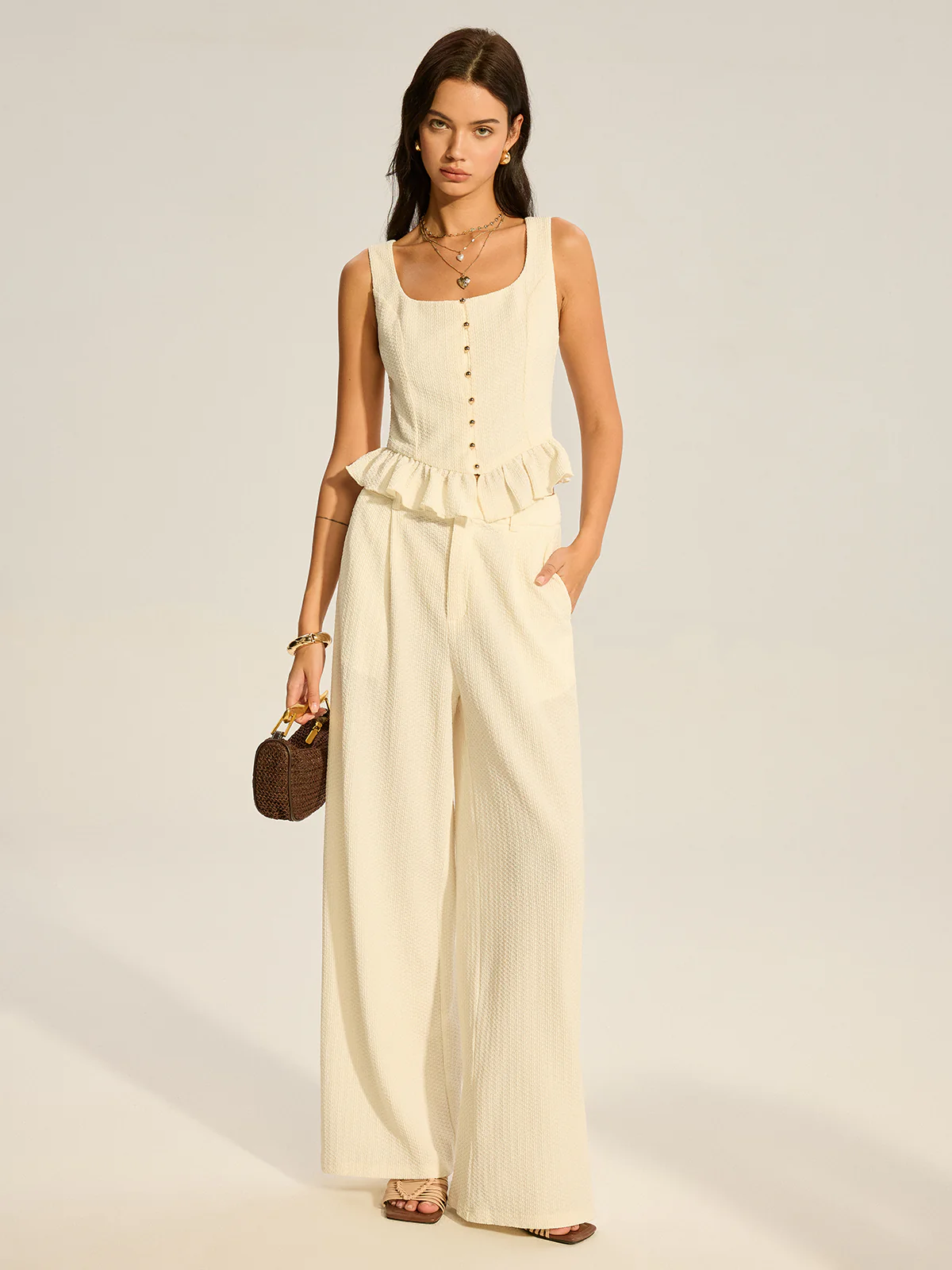Textured Peplum Top and Wide-Leg Pants Set