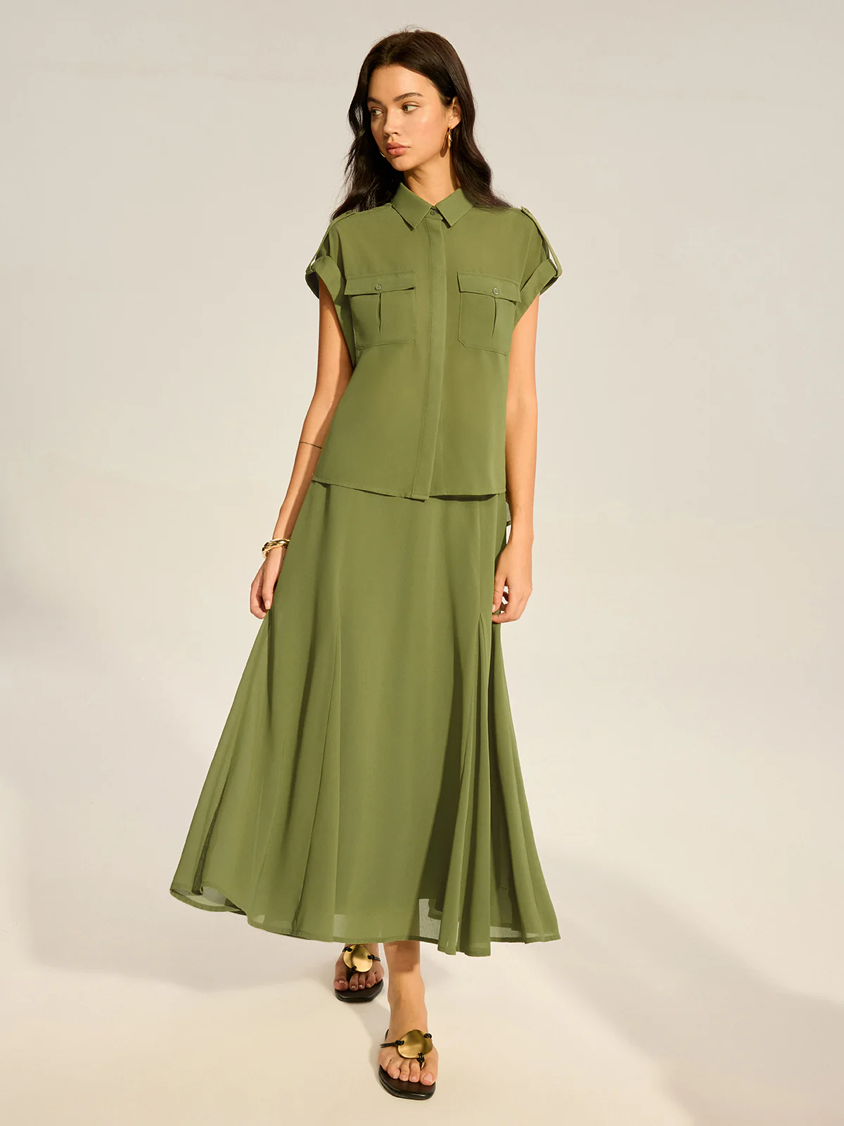 Rolled-Sleeve Pocketed Chiffon Shirt and Midi Skirt Set