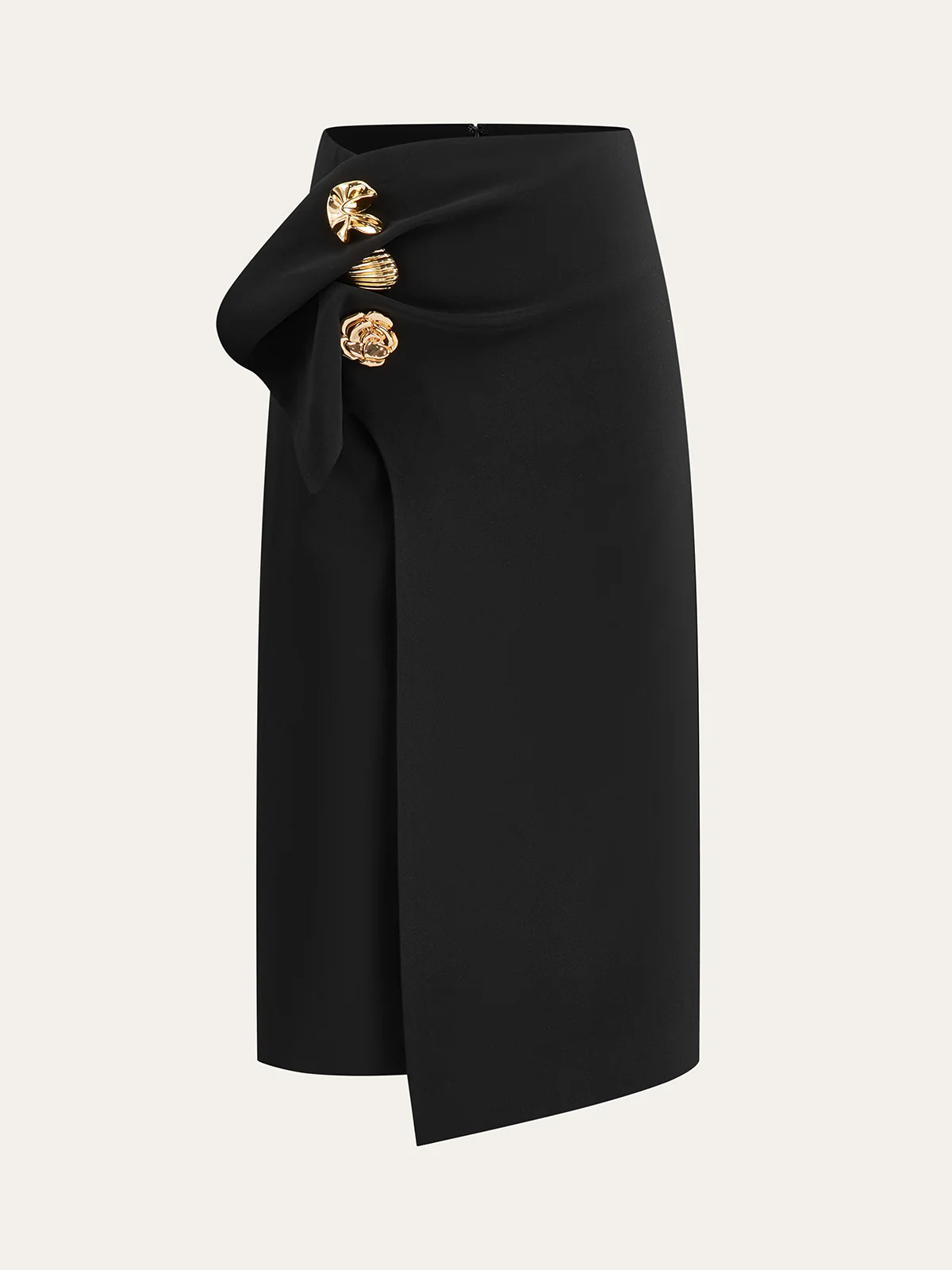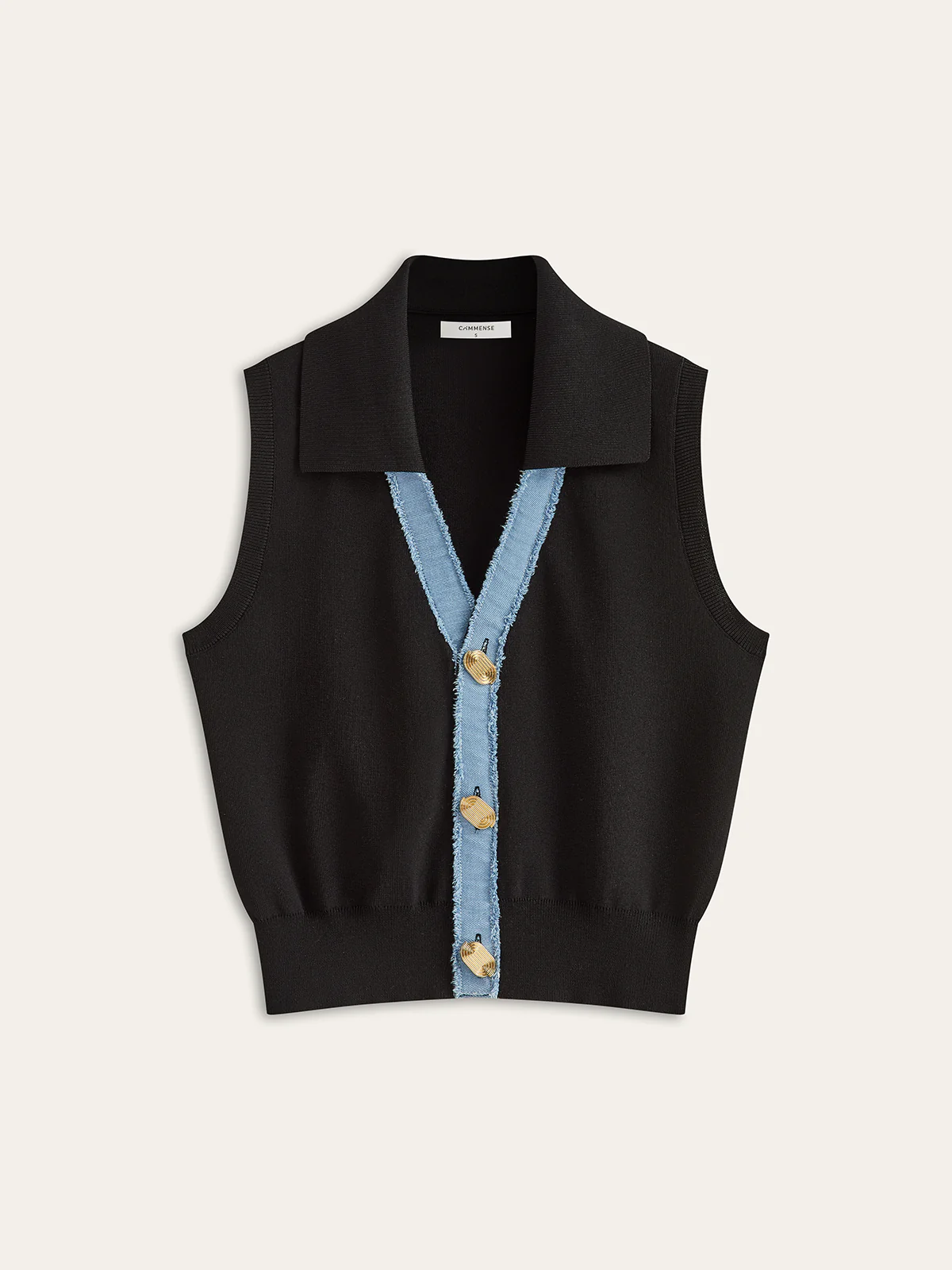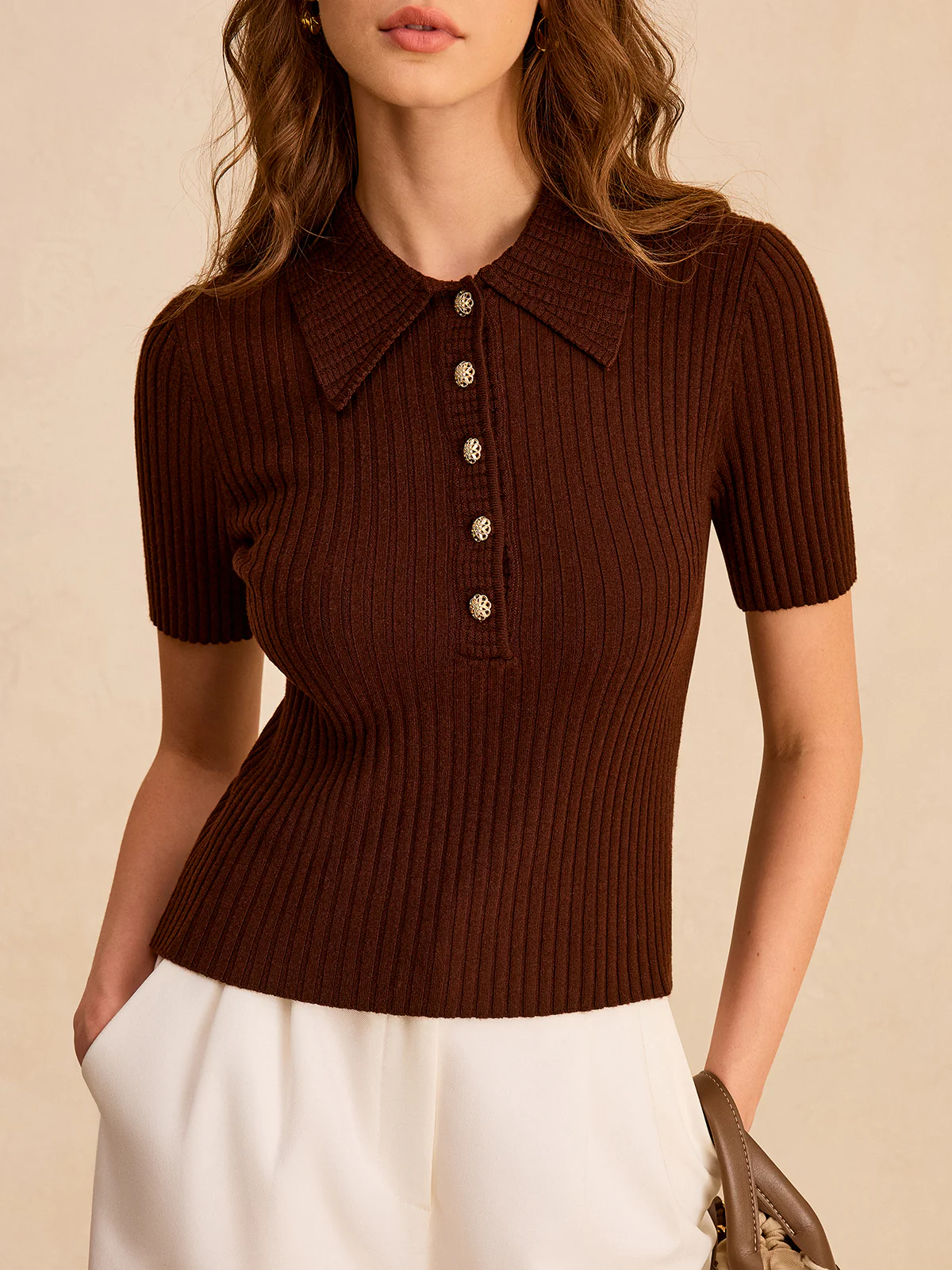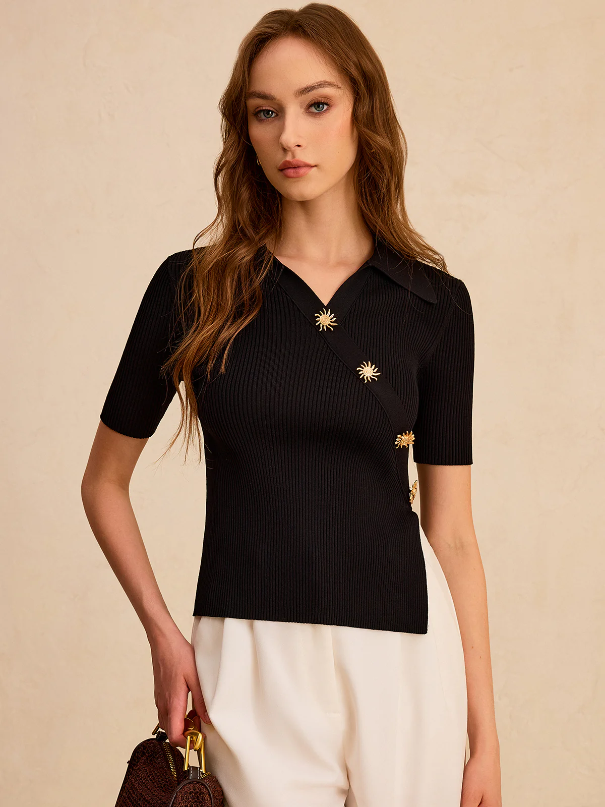 Asymmetric Metal Button Ribbed Knit Polo Top