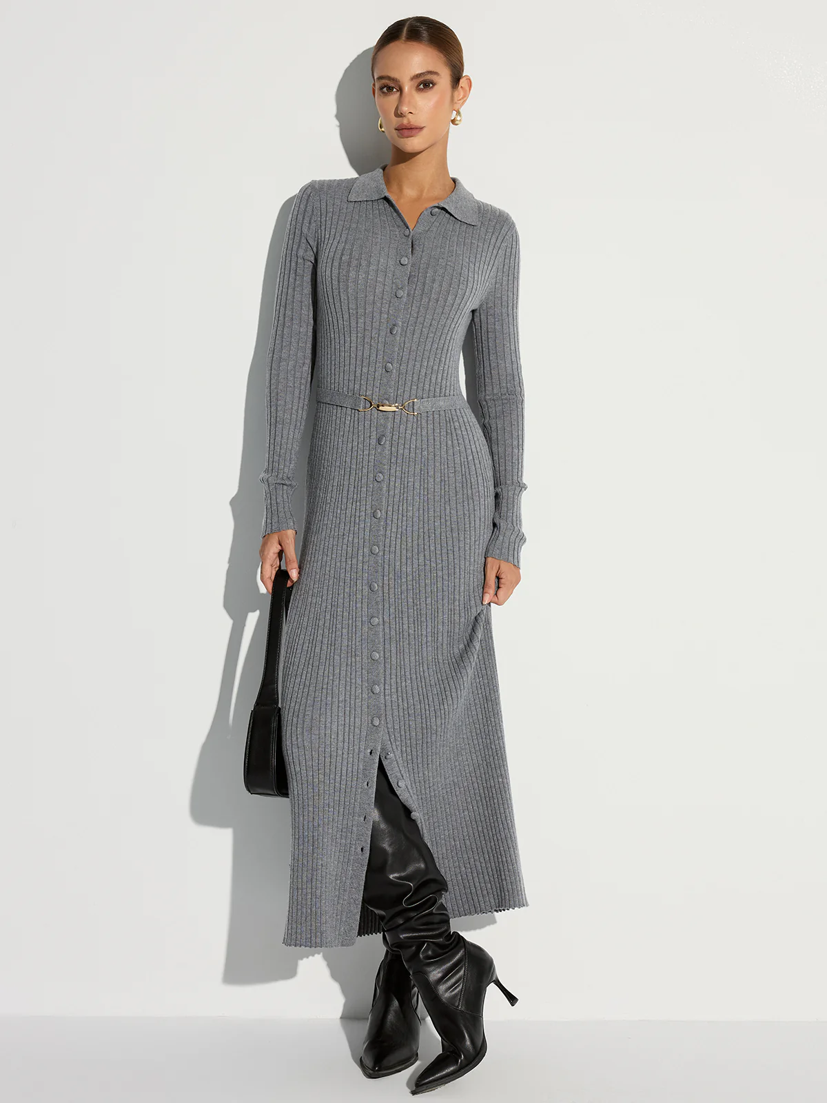 Ribbed Knit Polo Maxi Dress with Belt