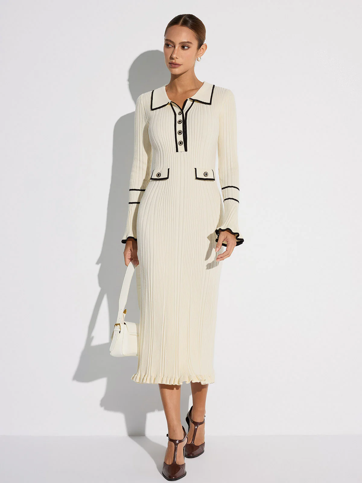 Contrast Trim Buttoned Ribbed Sweater Dress
