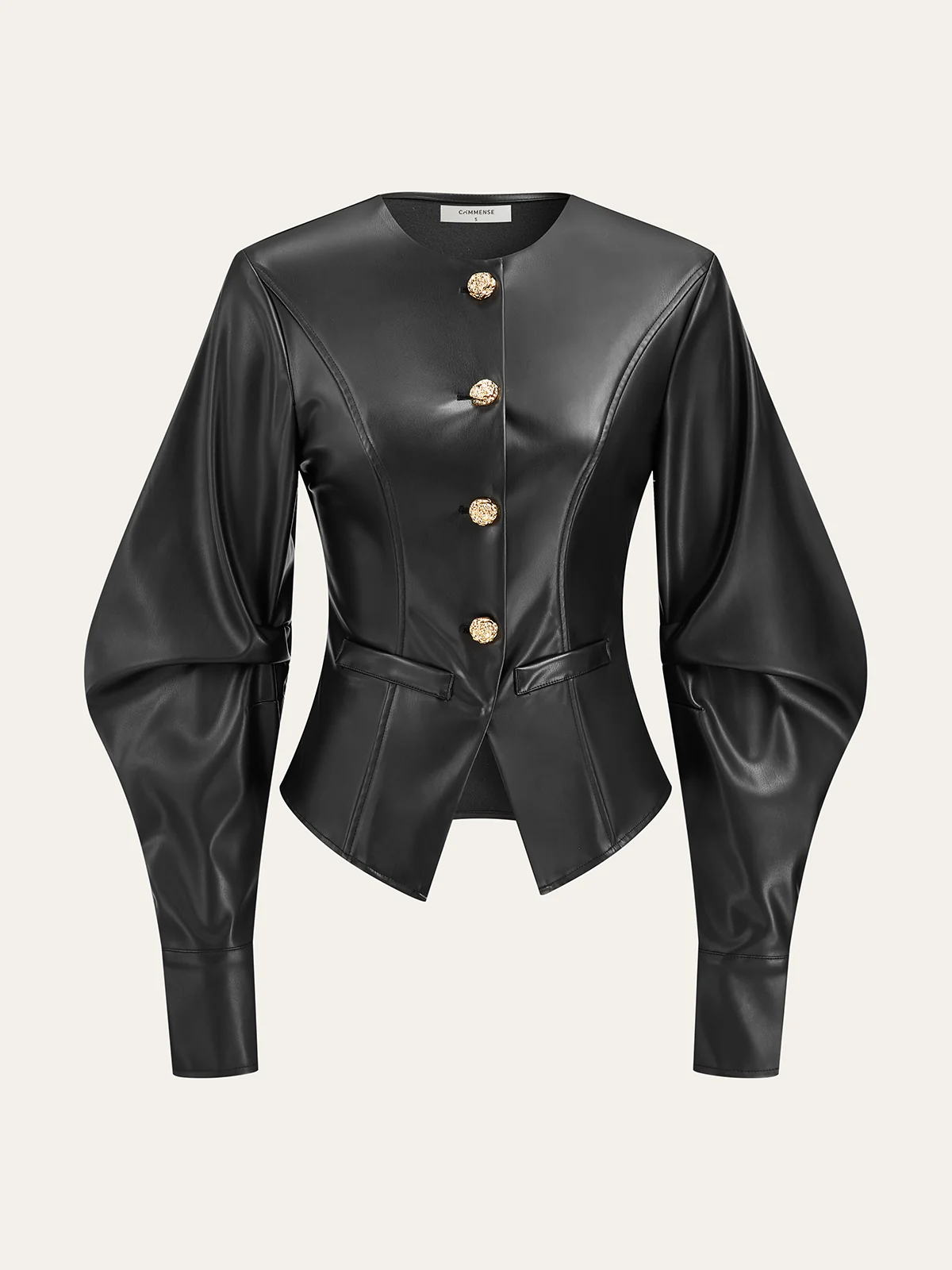 Metal Button Puffed Sleeve PU Leather Jacket