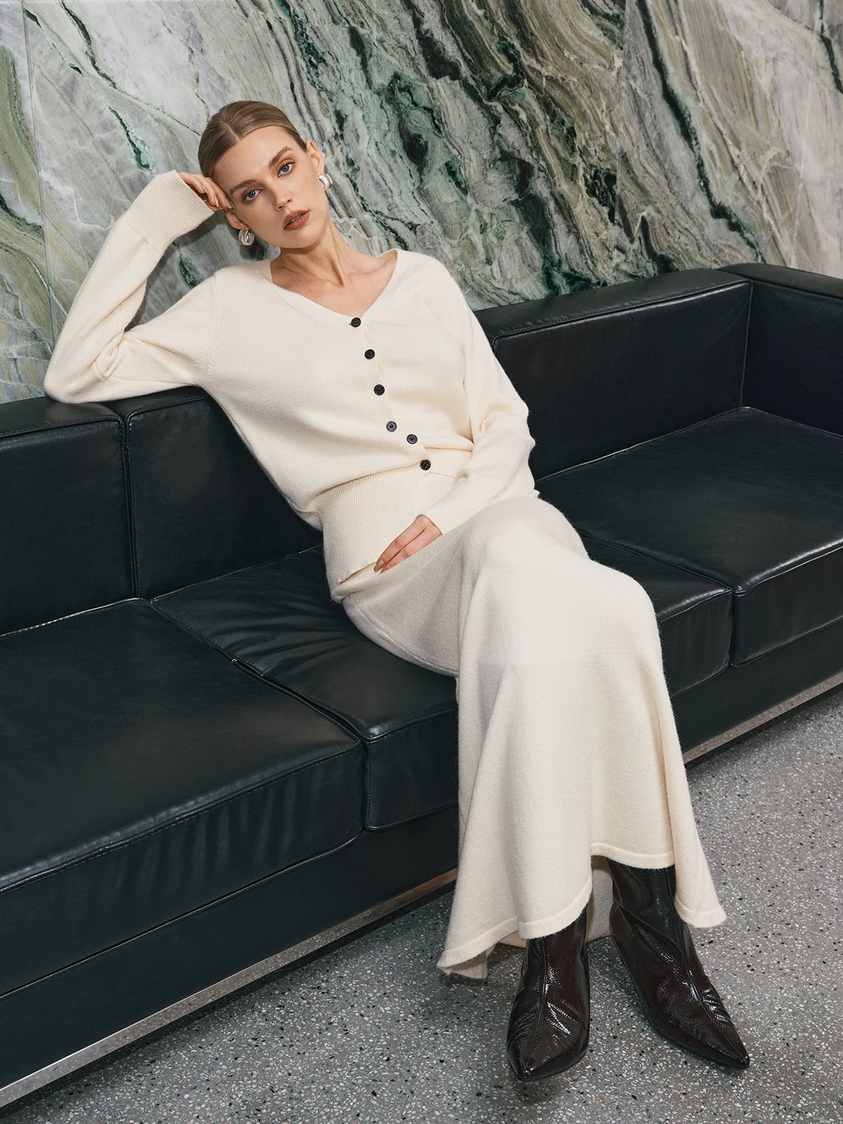 V-Neck Button-Front Knit Cardigan and Maxi Skirt Set