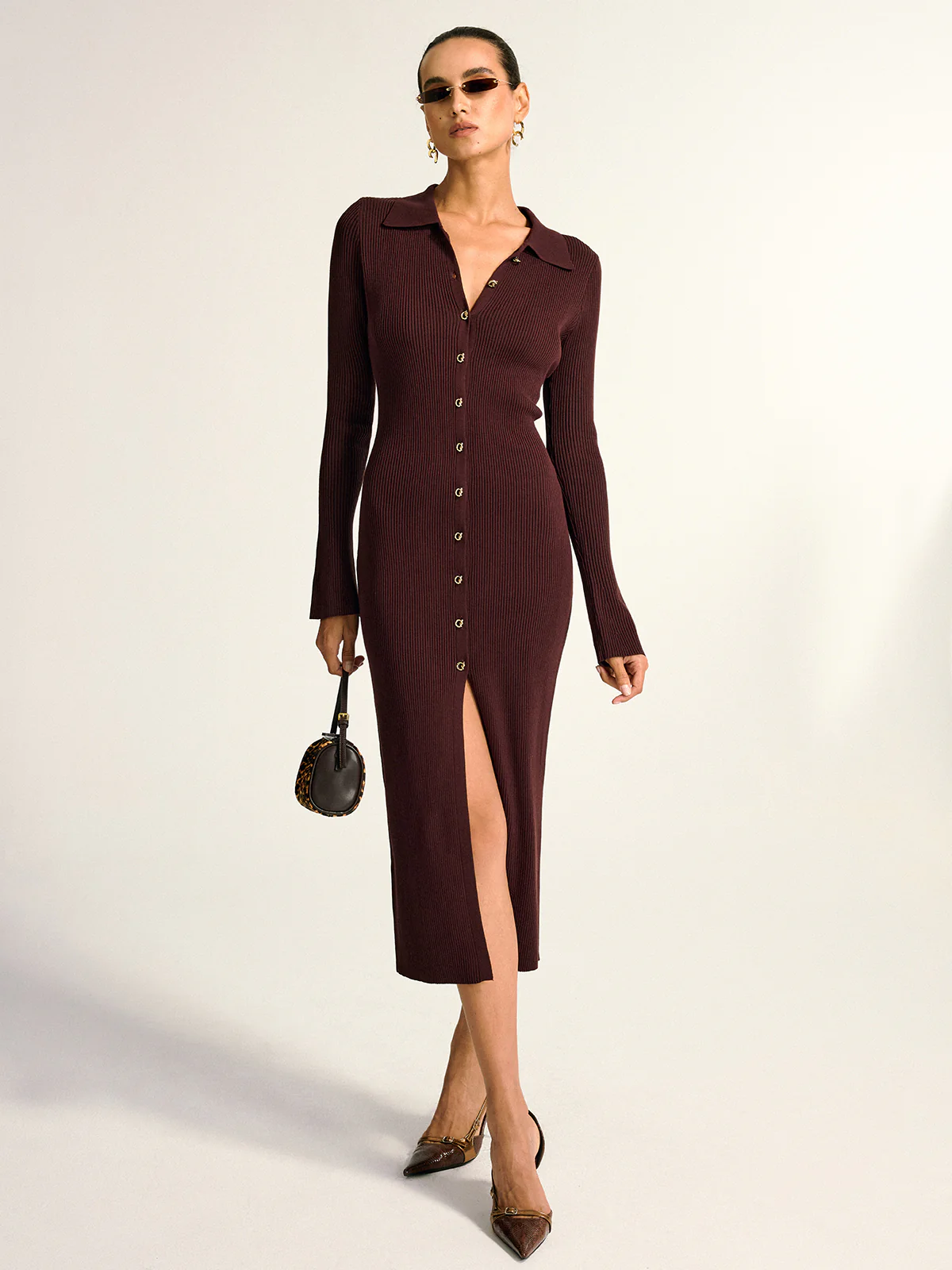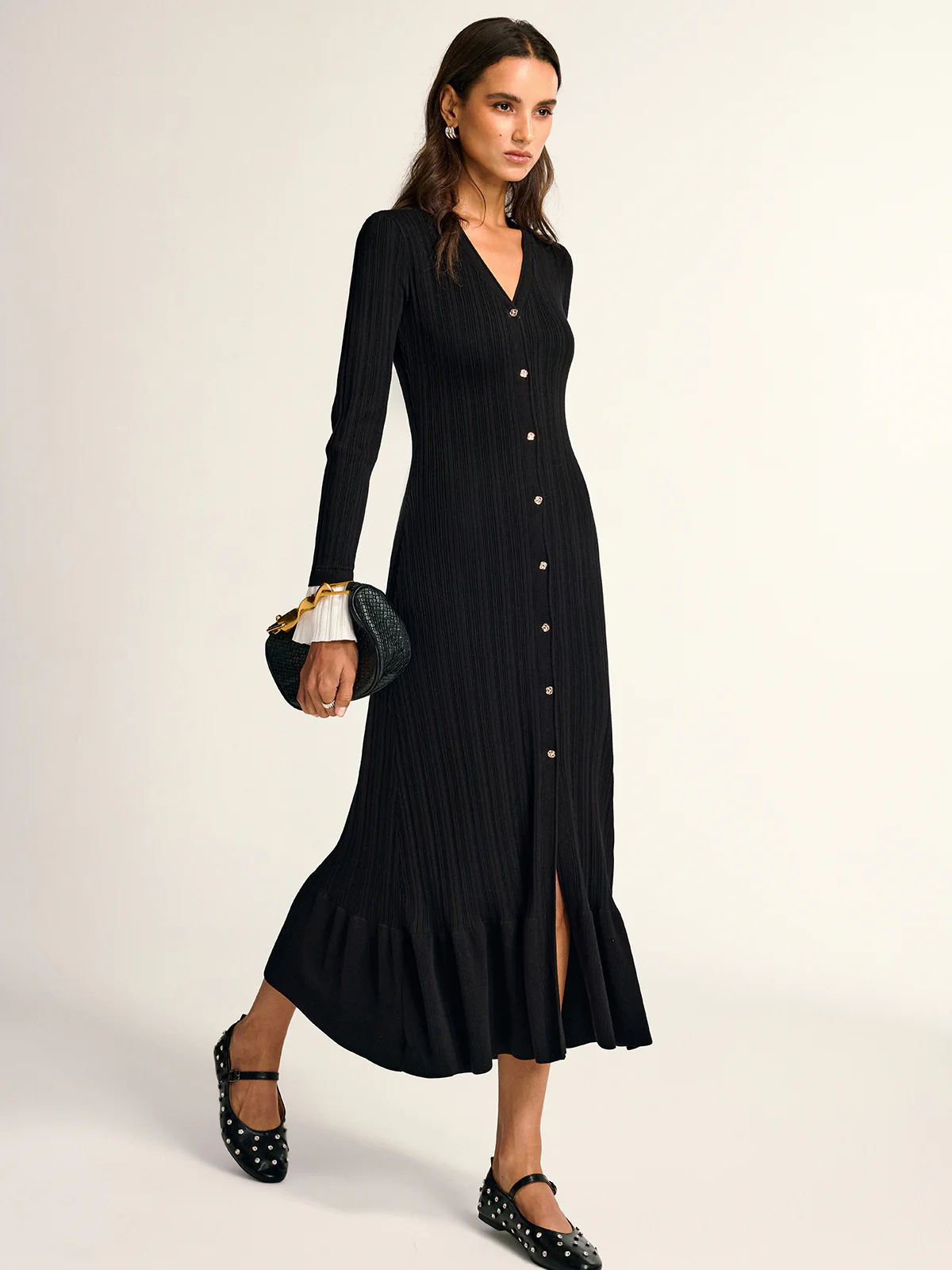 Ruffled Hem Button Front V-Neck Maxi Dress