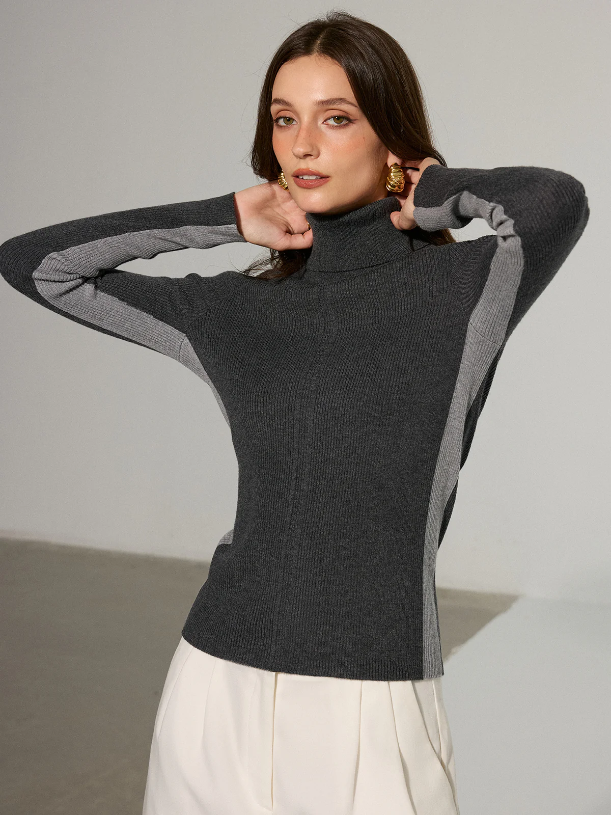 Mandarin Collar Sheer Panel Ribbed Knit Top