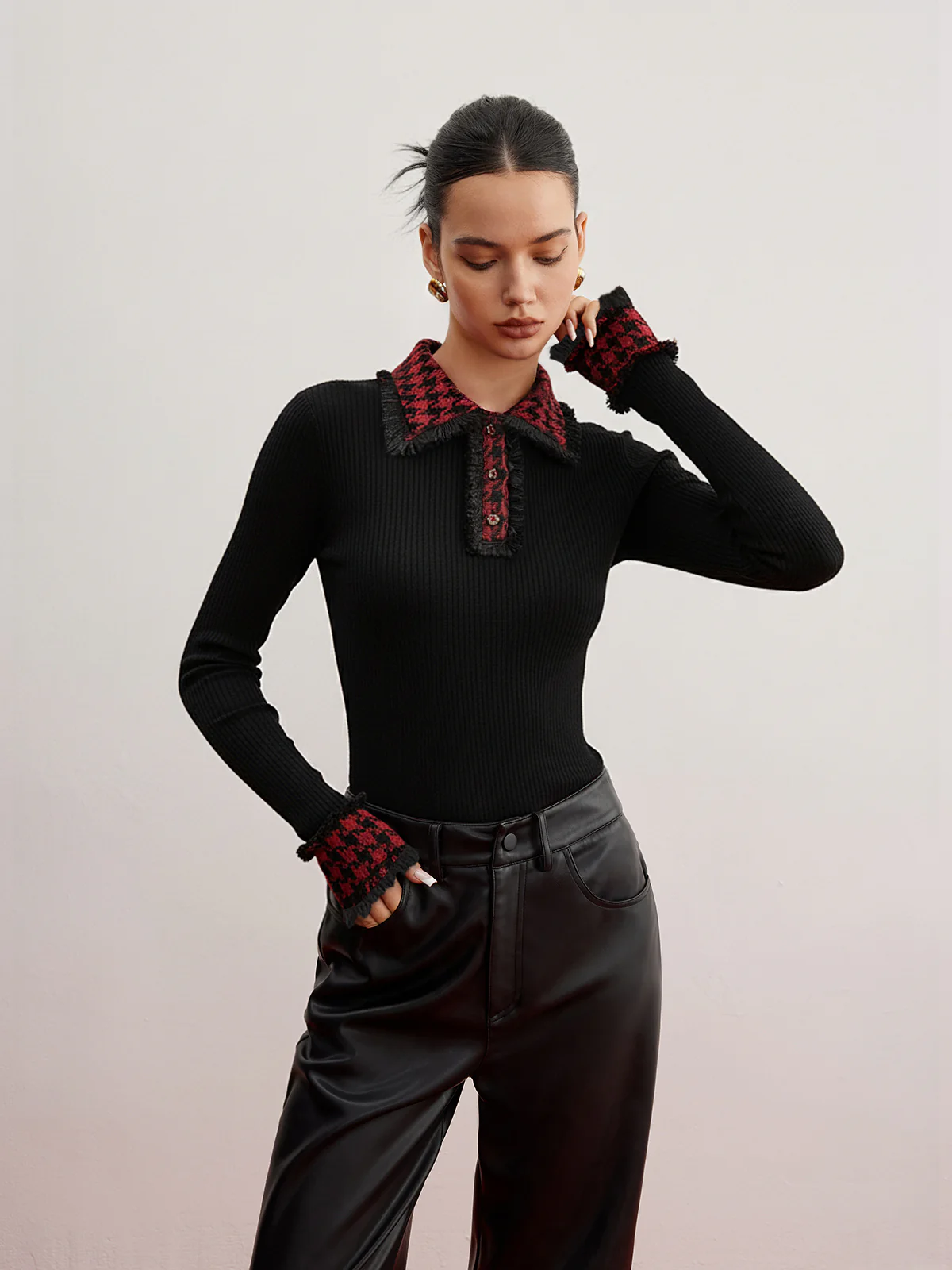 Contrast Checkered Collar Ribbed Knit Top