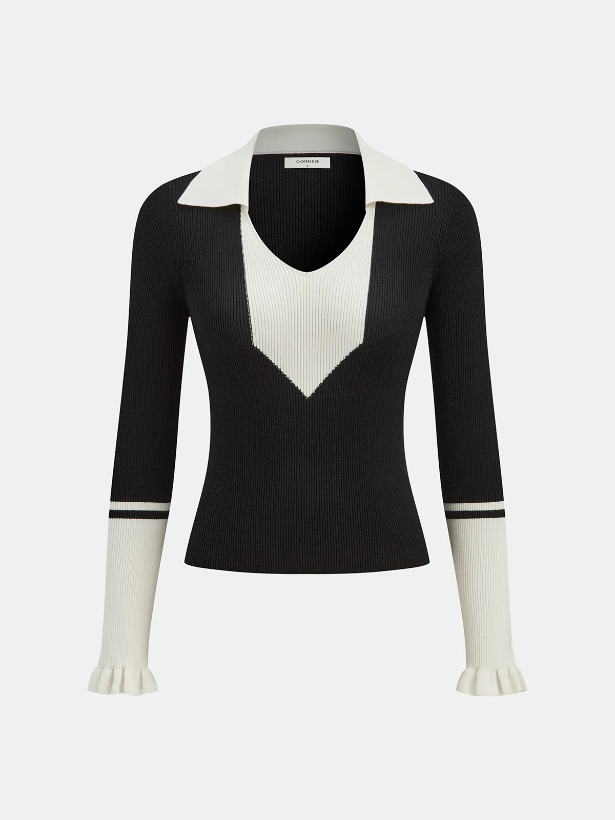 Ruffled Cuff Color-Block Collared Knit Top